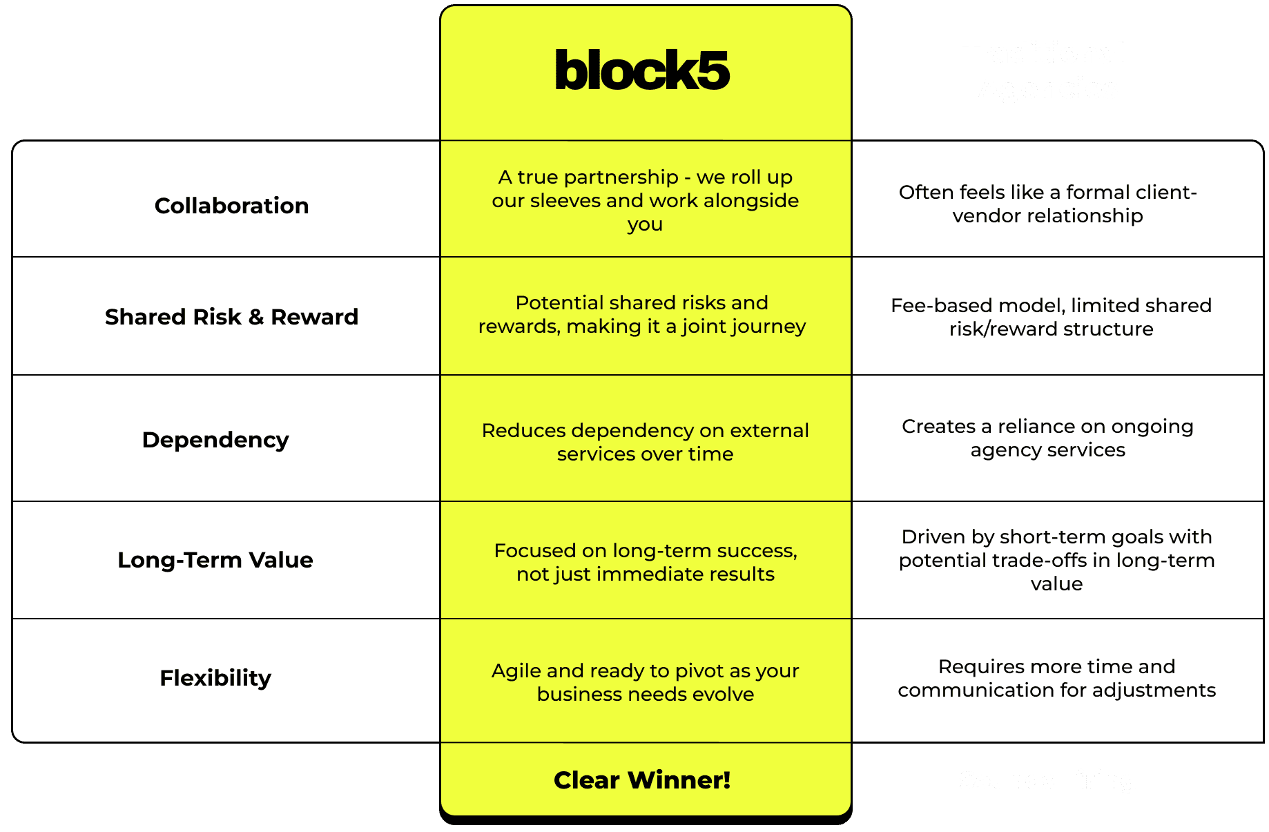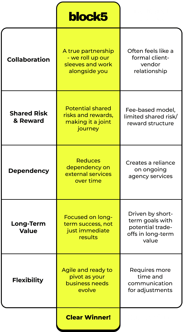 We're not an agency; we're your growth partner. While agencies often focus on short-term gains, we prioritize long-term success. Our collaborative approach goes beyond generating leads; we build systems for sustained growth. We empower you with strategic frameworks, ensuring your business thrives independently.